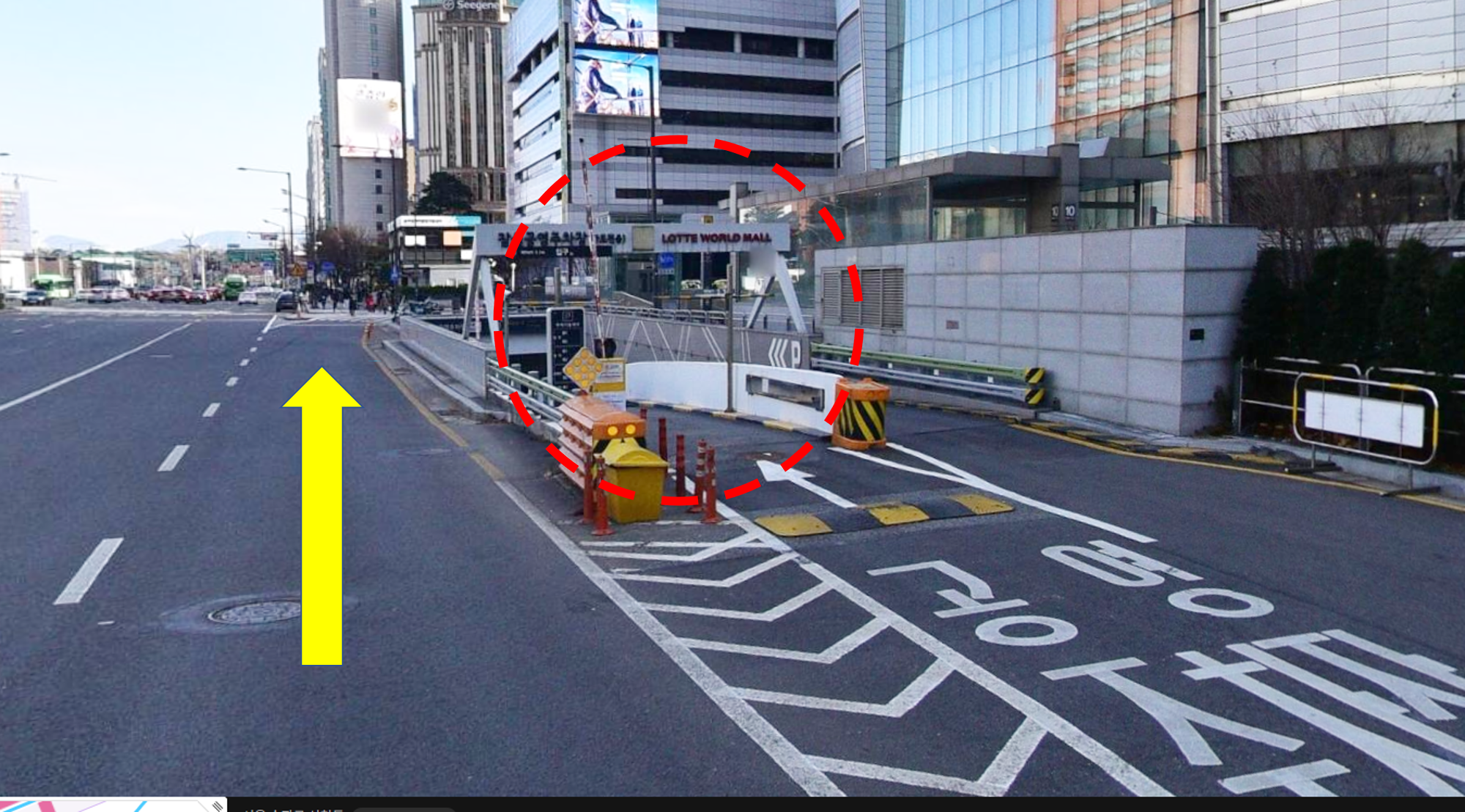 쉽게 설명 해 드리겠습니다. 보통 잠실 롯데타워몰 가실때 4번 공영주차장과 잠실역 롯데월드몰로 주차할 것입니다. 하지만 주말이나 사람이 많은 날에 이 방향으로 들어가시면 몇 시간은 주차장에서 시간을 낭비 할 수 있습니다. 무시하시고 노란색 화살표 방향으로 가시면 1번 입구가 보일겁니다.